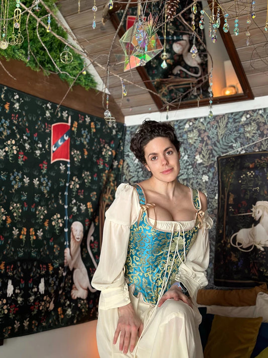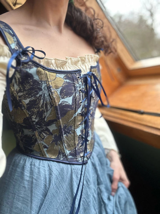 French Renaissance Front Lace-up Overbust Bodice in Blue & Gold Flowered Tapestry Fabric